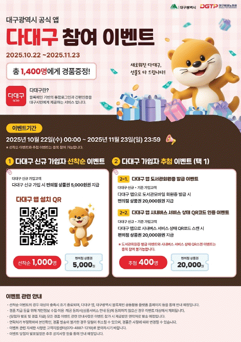 Àü½Ã ÇöÀå¿¡¼ ¡®´Ù´ë±¸¡¯ ¾Û ¸¸Á·µµ Á¶»ç¿¡ Âü¿©ÇÑ ½Ã¹Î ¼±Âø¼ø 200¸í¿¡°Ô Ä¿ÇÇ ÄíÆùÀ» ÁõÁ¤Çϰí, 10¿ù 22ÀϺÎÅÍ 11¿ù 23ÀϱîÁö ÇÑ ´Þ°£ ½Å±Ô °¡ÀÔÀÚ ¼±Âø¼ø 1,000¸í¿¡°Ô´Â 5õ¿ø±Ç »óǰ±ÇÀ» Áö±ÞÇÏ´Â ¿Â¶óÀÎ À̺¥Æ®µµ ÇÔ²² ÁøÇàµÈ´Ù.