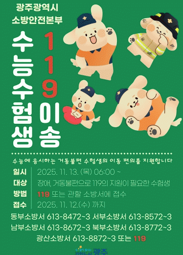 ¡®119 À̼ÛÁö¿ø ¼ºñ½º¡¯´Â Àå¾Ö³ª ºÎ»ó µîÀ¸·Î °Åµ¿ÀÌ ºÒÆíÇÑ ¼öÇè»ýµéÀ» ½ÃÇè ´çÀÏ 119±¸±ÞÂ÷·Î À̼ÛÇÏ´Â ¼ºñ½º´Ù. ½ÃÇè ³¯ ¾ÆÄ§¿¡ ¼öÇè»ýÀ» ÀÚÅÿ¡¼ ½ÃÇèÀå±îÁö µ¥·Á´ÙÁÖ°í, ½ÃÇèÀÌ ³¡³ µÚ¿¡´Â ´Ù½Ã ÀÚÅÃÀ¸·Î À̼ÛÇÑ´Ù.