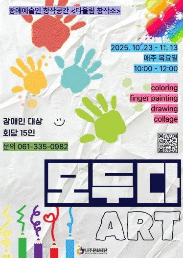 ³ªÁÖ¹®ÈÀç´Ü(ÀÌ»çÀå À±º´ÅÂ)Àº Àå¾Ö ¿¹¼úÀÎÀÇ ÀÚ¸³ ±â¹Ý ¸¶·Ã°ú »çȸÀû ÀÎ½Ä °³¼±À» ¸ñÇ¥·Î ¿À´Â 11¿ù 13ÀϱîÁö ¸ÅÁÖ ¸ñ¿äÀÏ ¡®´Ù¿ï¸² âÀÛ¼Ò¡¯¿¡¼ ¹Ì¼úâÀÛ ÇÁ·Î±×·¥ ¡®¸ðµÎ´ÙART¡¯¸¦ ÁøÇàÇÑ´Ù°í 30ÀÏ ¹àÇû´Ù.