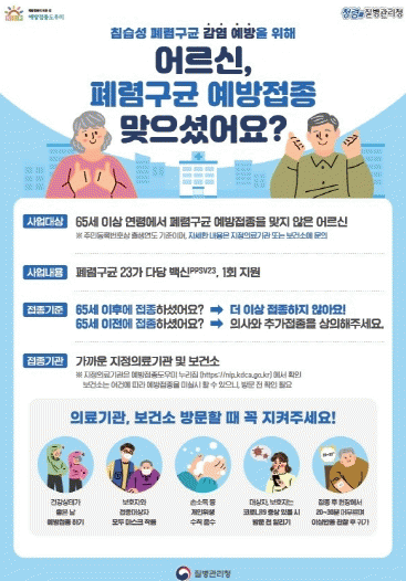 Áö¿øµÇ´Â ¹é½ÅÀº Æó·Å±¸±Õ 23°¡ ´Ù´ç¹é½Å(PPSV23)ÀÌ¸ç Æò»ý 1ȸ ¹«·á Á¢Á¾ÀÌ Áö¿øµÈ´Ù. ¸¸¾à 64¼¼ ÀÌÀü¿¡ Æó·Å±¸±Õ ¹é½ÅÀ» Á¢Á¾Çß´Ù¸é ¹é½ÅÁ¾·ù¿¡ µû¶ó Á¢Á¾ °¡´É ¿©ºÎ¿Í Á¢Á¾ ½Ã±â°¡ ´Ù¸£¹Ç·Î º¸°Ç¼Ò¿¡ ¹®ÀÇÇÏ¸é µÈ´Ù.