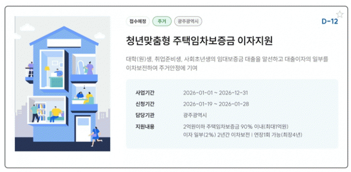 ÀÌ »ç¾÷Àº û³âÀÌ Àü?¿ù¼¼ ÀÓÂ÷º¸Áõ±ÝÀ» ´ëÃâÇÒ ¶§ ¹ß»ýÇÏ´Â ÀÌÀÚ¸¦ ÀϺΠÁö¿øÇÏ´Â »ç¾÷ÀÌ´Ù. ±¤Áֽð¡ ´ë»óÀÚ¸¦ ¼±Á¤ÇÏ¸é ±¤ÁÖÀºÇàÀÌ ´ëÃâÀ» ½ÇÇàÇϰí Çѱ¹ÁÖÅñÝÀ¶°ø»ç°¡ ´ëÃâÀ» 100% º¸ÁõÇÑ´Ù.