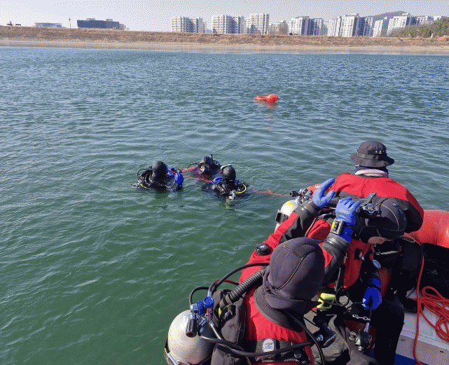 ÀÌ¾î ±¸Á¶´ë¿øµéÀº Àá¼öÀåºñ¿Í ·ÎÇÁ, ±¸Á¶º¸Æ® µî Àü¹® Àåºñ¸¦ Ȱ¿ëÇØ ¾óÀ½ ¹Ø¿¡ °í¸³µÈ ±¸Á¶´ë»óÀÚ¸¦ ±¸Á¶ÇÏ´Â ÈÆ·ÃÀ» Àü°³Çß´Ù.