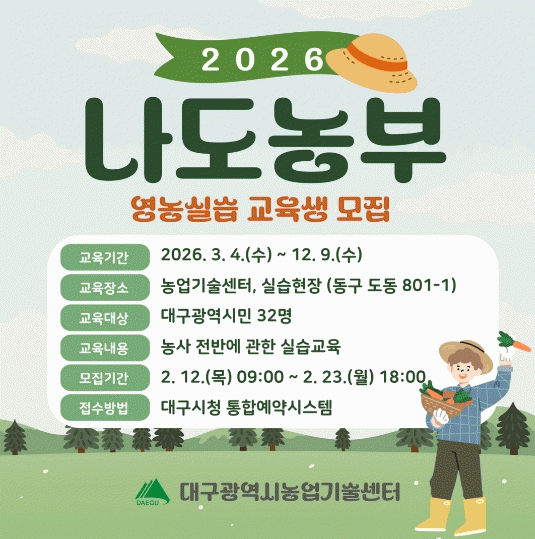 ±³À° ½ÅûÀº 2¿ù 12ÀÏ(¸ñ) ¿ÀÀü 9½ÃºÎÅÍ 2¿ù 23ÀÏ(¿ù) ¿ÀÈÄ 6½Ã±îÁö ´ë±¸±¤¿ª½Ã ÅëÇÕ¿¹¾à½Ã½ºÅÛÀ» ÅëÇØ ¿Â¶óÀÎÀ¸·Î Á¢¼öÇÒ ¼ö ÀÖ´Ù. ¸ðÁý ÀοøÀº 32¸í Á¤µµ·Î, ¼±Âø¼øÀÌ ¾Æ´Ñ Ãß÷Á¦·Î ¼±¹ßÇÏ¸ç ´ë±¸³ó¾÷±â¼ú¼¾ÅÍÀÇ ³ó¾÷±âÃʱ³À°(±Í³ó±ÍÃÌ, µµ½Ã³ó¾÷Àü¹®°¡ °úÁ¤) ¼ö·á»ýÀ» ¿ì¼± ¼±¹ßÇÑ´Ù.