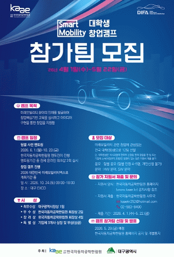 Âü°¡ ½ÅûÀº 5¿ù 22ÀϱîÁö Çѱ¹ÀÚµ¿Â÷°øÇÐÇѸ²¿ø ȨÆäÀÌÁö¿¡¼ ½ÅûÇÒ ¼ö ÀÖ´Ù. ¼±¹ßµÈ 12°³ ÆÀÀº ¾à 5°³¿ù°£ Àü¹® ÇÁ·Î±×·¥À» °ÅÄ£ µÚ, ¿À´Â 10¿ù ¡®¹Ì·¡Çõ½Å±â¼ú¹Ú¶÷ȸ(FIX 2026)¡¯ ±â°£ Áß ¿¸®´Â °æ¿¬´ëȸ¿¡¼ ÃÖÁ¾ ¼º°ú¸¦ ¹ßÇ¥ÇÏ°Ô µÈ´Ù.