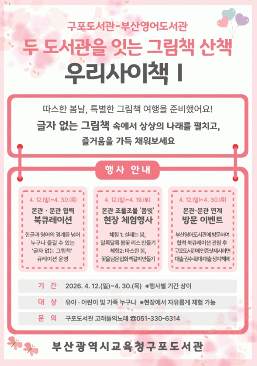 ¹Ý´ë·Î ±¸Æ÷µµ¼°ü¿¡¼ ºÏÅ¥·¹ÀÌ¼Ç °ü¶÷ ÈÄ ºÎ»ê¿µ¾îµµ¼°üÀ» ¹æ¹®ÇÑ ÀÌ¿ëÀÚ¿¡°Ôµµ ¡ã´ëÃ⠱Ǽö È®´ë ¡ã´ëÃâ Á¤Áö ÇØÁ¦ ¡ãFun Reading with Volunteers, ¹®ÇØÆÎ¡¤¼ö¸®ÆÎ ÇÁ·Î±×·¥ Âü¿© ±âȸ¸¦ Á¦°øÇÑ´Ù.