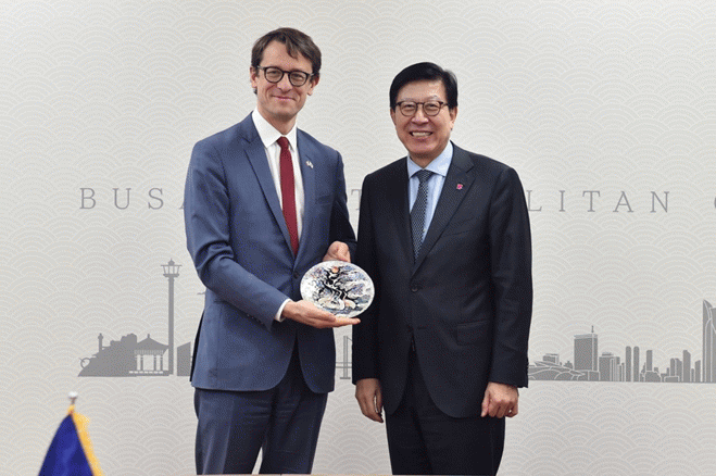 ¹Ú ½ÃÀåÀº ¸ÕÀú Çʸ³ º£¸£Åõ ÁÖÇÑÇÁ¶û½º´ë»ç¿¡°Ô ¡°ºÎ»ê ¹æ¹®À» Áø½ÉÀ¸·Î ȯ¿µÇÑ´Ù. ºÎ»ê°ú ÇÁ¶û½º´Â ¹®È¡¤¿¹¼ú, °æÁ¦¡¤Åë»ó µî ´Ù¾çÇÑ ºÐ¾ß¿¡¼ ¼·Î Çù·ÂÇØ »óÈ£¹ßÀüÇÒ ¼ö ÀÖ´Â ÁÁÀº ÆÄÆ®³Ê°¡ µÇ¸®¶ó »ý°¢ÇÑ´Ù¡±¶ó°í ȯ¿µ Àλ縦 ÀüÇß´Ù.