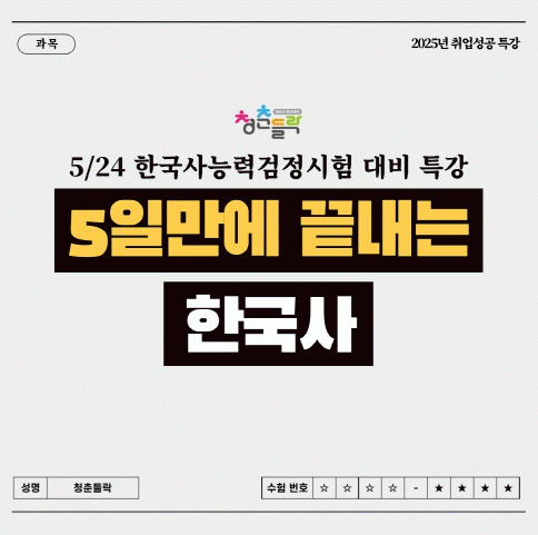 Çѱ¹»ç ¼ö¾÷Àº 5¿ù 24ÀÏ Çѱ¹»ç´É·Â°ËÁ¤½ÃÇèÀ» ´ëºñÇÑ Æ¯°À¸·Î Çѱ¹»çÀÇ ÁÖ¿ä ½Ã´ëº° ³»¿ëÀ» Áß½ÉÀ¸·Î ÁýÁß¡¤ÇнÀÇϰí, ±âÃâ¹®Á¦¸¦ Ç®¾î°¡¸ç ÇÙ½É »çÇ×À» Á¡°ËÇÑ´Ù. ¼ö¾÷ ÀϽô 5¿ù 15ÀÏ, 16ÀÏ, 21ÀϺÎÅÍ 23ÀϱîÁö ¿ÀÈÄ 7½Ã±îÁö ÃÑ 5ȸÂ÷·Î ÁøÇàµÈ´Ù.