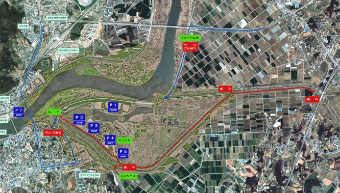ÃàÁ¦Àå¿¡¼ ³ª°¡´Â ±æÀº Á¦ 1ÁÖÂ÷ÀåÀÇ °æ¿ì ÀÔ±¸ ¹Ý´ëÆí Ãⱸ¸¦ ÀÌ¿ëÇØ ¹°³ÑÀÌ ±¸°£ »ï°Å¸®·Î ÁøÀÔÇØ Á¦¹æµµ·Î³ª ¿µ»êõ ¹æÇâÀ¸·Î ºüÁ®³ª°¡¸é µÈ´Ù. ¶Ç ÃàÁ¦ÀåÀ̳ª Àα٠ÀÓ½ÃÁÖÂ÷Àå ÀÌ¿ë Â÷·®ÀÌ Çà»çÀå¿¡¼ ³ª¿Ã ¶§´Â ¿µ»êõÀ̳ª Àü³²¿Ü±¹¾î°í±³ ¹æÇâÀ¸·Î ºüÁ®³ª°¡µµ·Ï Çß´Ù.