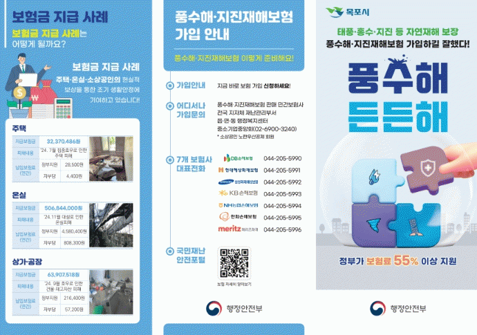 ¡®Ç³¼öÇØ¡¤ÁöÁøÀçÇØº¸Ç衯Àº ÅÂdz, È£¿ì, È«¼ö, °Ç³ µî dz¼öÇØ¿Í ÁöÁøÀ¸·Î ÀÎÇÑ ÇÇÇØ¸¦ Æø³Ð°Ô º¸ÀåÇÏ´Â Á¤Ã¥¼º º¸ÇèÀ¸·Î, °¡ÀÔ ´ë»óÀº ¡ãÁÖÅÃ(µ¿»ê Æ÷ÇÔ) ¡ã¿Â½Ç(ºñ´ÒÇϿ콺 Æ÷ÇÔ) ¡ã»ó°¡¡¤°øÀå(¼Ò»ó°øÀÎ) µîÀ̸ç, º¸Çè±â°£Àº 1³âÀÌ´Ù. º¸Çè·á´Â ½Ã¼³ À¯Çü°ú ´ë»ó¿¡ µû¶ó Â÷µî Áö¿øµÈ´Ù.