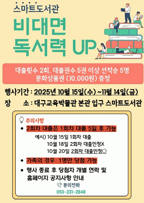 ¡®ºñ´ë¸é µ¶¼·ÂUP¡¯Àº 10¿ù 15ÀϺÎÅÍ 11¿ù 14ÀϱîÁö ´ë±¸±³À°¹Ú¹°°ü(ºÏ±¸ ´ëµ¿·Î1±æ 40) º»°ü ÀÔ±¸¿¡ À§Ä¡ÇÑ ½º¸¶Æ®µµ¼°ü ±â±â¿¡¼ ÃÑ 2ȸ, 5±ÇÀÇ µµ¼ ´ëÃâ ¼ºñ½º¸¦ ÀÌ¿ëÇÏ´Â ÀÌ¿ëÀÚ ¼±Âø¼ø 5¸í¿¡°Ô ¸ð¹ÙÀÏ ¹®È»óǰ±Ç(10,000¿ø)À» ÁõÁ¤ÇÏ´Â Çà»ç´Ù.