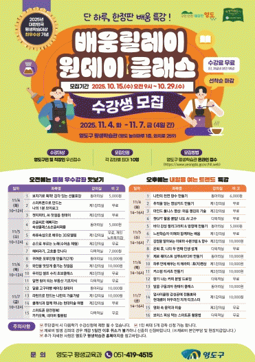 ¼ö°½ÅûÀº 10¿ù 29ÀϱîÁö ¿µµµ±¸ Æò»ýÇнÀ°ü ȨÆäÀÌÁö¸¦ ÅëÇØ ¼±Âø¼ø Á¢¼ö·Î ÁøÇàµÈ´Ù.
