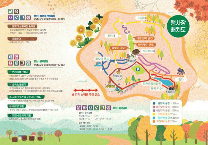 Çà»ç Àå¼Ò´Â µÎ °÷¿¡¼ ÁøÇàµÇ¸ç ¹°¸ÂÀ̰ñ »ê¸²¿åÀå¿¡¼´Â ½£ °È±â ½ºÅÆÇÁ Åõ¾î, ½£ ÇØ¼³, Á¤¿ø Åõ¾î°¡ ÁøÇàµÇ°í, ºÒ¹«°ø¿ø¿¡¼´Â ¹Ý·Á½Ä¹° ¸¸µé±â, º¸¹°Ã£±â, ½£¼Ó ÀÛÀº Ã¥¹æ, ÆäÀ̽ºÆäÀÎÆÃ, ·¹Æ®·ÎüÇè(´Þ°í³ª, »Ì±â µî), ±è¹ä¸¸µé±â µî ¾ÆÀ̵é°ú ÇÔ²²ÇÏ´Â ´Ù¾çÇÑ Ã¼Çè ÇÁ·Î±×·¥ÀÌ ÁøÇàµÈ´Ù.