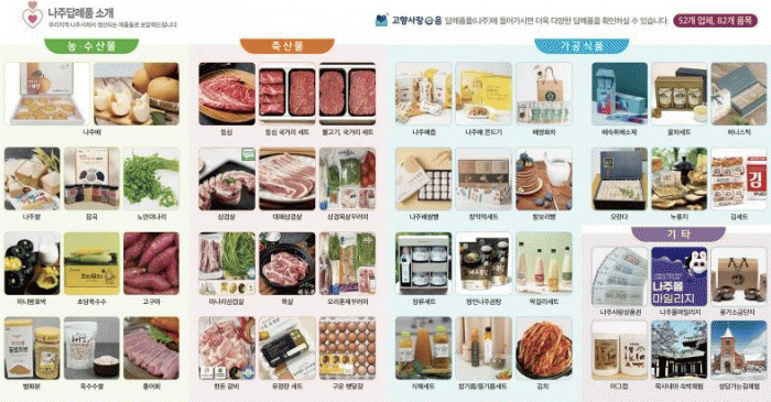 ³ªÁֽô ±âºÎÀÚ¿¡°Ô Á¦°øÇÒ ´ä·ÊǰÀ¸·Î 52°³ °ø±Þ¾÷ü¿Í Çù¾àÀ» ¸Î¾î ´ä·Êǰ¸ôÀ» ¿î¿µÇϰí ÀÖ´Ù. ´ä·ÊǰÀº ³ªÁÖ¹è, ³ªÁÖ½Ò, È«¾îȸ µîÀ¸·Î ±¸¼ºµÈ ³ó¡¤¼ö»ê¹°°ú µî½É, »ï°ã»ì, ¸ñ»ì µîÀ¸·Î ±¸¼ºµÈ Ãà»ê¹°, ¹èÁó, ³ªÁÖ¹è Â˵å±â, ¹è ½ÖÈÂ÷ µîÀ¸·Î ±¸¼ºµÈ °¡°ø½ÄǰÀ» ºñ·ÔÇÏ¿© ³ªÁÖ ½Ã³» »ó°¡¿¡¼ ÀÚÀ¯·Ó°Ô »ç¿ëÇÒ ¼ö ÀÖ´Â ³ªÁÖ»ç¶û»óǰ±Ç µîÀÌ °íÇâ»ç¶ûeÀ½ ´ä·Êǰ ¸ô¿¡ µî·ÏµÇ¾î ÀÖ´Ù.