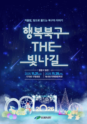 11¿ù 21ÀÏ 17½Ã ºÏ±¸Ã» ±¤Àå°ú 11¿ù 25ÀÏ 16½Ã 50ºÐ Ä¥°î3Áö±¸ ¹®È¿¹¼ú°Å¸® ÀÌÅ¿ø¹®Çаü ¾Õ¿¡¼ Å©¸®½º¸¶½ºÆ®¸® Á¡µî½ÄÀ» ½ÃÀÛÀ¸·Î ¿î¿µµÇ´Â ºû °Å¸®´Â ³»³â 1¿ù 31ÀϱîÁö Àϸô ÀÌÈÄ ºûÀ¸·Î ¹°µå´Â ¾Æ¸§´Ù¿î °Å¸®·Î ¸¸³¯ ¼ö ÀÖ´Ù. 21ÀÏ Á¡µî½ÄÀº ¹ÂÁöÄùè¿ì °°Àº À帣(±èÇü¼®), ¹®ÀçÁî¹êµå, ºÎȰ 4´ë º¸Äà ±èÀçÈñ µî ´Ù¾çÇÑ ¹«´ë °ø¿¬°ú ÇÔ²² ÁøÇàµÈ´Ù. ¶ÇÇÑ °¡Á·¡¤Ä£±¸¡¤¿¬Àΰú ÇÔ²² Áñ±æ ¼ö ÀÖ´Â Áï¼®³×ÄÆ, »÷µå¾ÆÆ® ºû üÇè, ¶óÀÎ¾ÆÆ® ºû³îÀÌ µî üÇè ÇÁ·Î±×·¥µµ 22½Ã±îÁö ¿î¿µµÈ´Ù. ºû °Å¸®´Â ¸ÅÀÏ Àϸô ÀÌÈÄ Á¡µîµÇ¸ç, ³»³â 1¿ù ¸»±îÁö °Ü¿ï¹ãÀ» ¹àÈ÷´Â ¾Æ¸§´Ù¿î °Å¸®·Î ÁÖ¹ÎÀ» ¸ÂÀÌÇÑ´Ù.