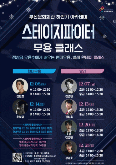 À̹ø ¾ÆÄ«µ¥¹Ì´Â 12¿ù 6¡¤7ÀÏ, 13¡¤14ÀÏ, 20¡¤21ÀÏ ÃÑ 3ÁÖ°£ ÁÖ¸»¸¶´Ù ÁøÇàµÇ¸ç, ºÎ»ê¿¡¼ ¼ºÀÎ ¹ß·¹, ¼ºÀÎ Çö´ë¹«¿ëÀ» Ãë¹Ì·Î ¹è¿ì°íÀÚ ÇÏ´Â »ç¶÷µé¿¡°Ô Èñ¼Ò½ÄÀÌ´Ù.