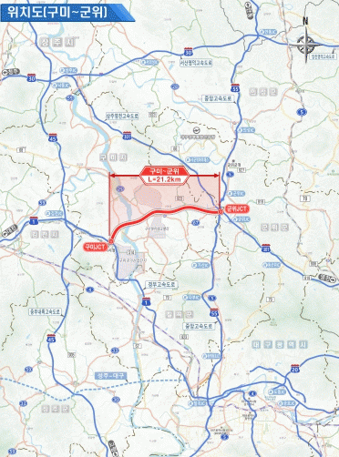 ±¸¹Ì¿Í ±ºÀ§¸¦ ¿¬°áÇÏ´Â ±¸¹Ì-±ºÀ§ °í¼Óµµ·Î´Â ´ë±¸ ºÏºÎ Áß¾Ó°í¼Óµµ·Î¿Í °æºÏ ¼ºÎ °æºÎ°í¼Óµµ·Î¸¦ µ¿¼·Î ¿¬°áÇÏ´Â ±¹°¡°£¼±µµ·Î¸ÁÀ̸ç, ¿Õº¹ 4Â÷¼± ¿¬Àå 21.2km ±Ô¸ð·Î ÃÑ»ç¾÷ºñ 1Á¶ 5,627¾ï ¿øÀ» ÅõÀÔÇØ 2029³â Âø°øÀ» ¸ñÇ¥·Î ±¹°¡ ÀçÁ¤ »ç¾÷À¸·Î º»°Ý ÃßÁø µÈ´Ù.