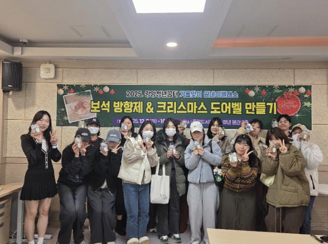12¿ù 9ÀÏ ¿¸° º¸¼® ¹æÇâÁ¦ ¸¸µé±â Ŭ·¡½º¿¡¼´Â û³âµéÀÌ °¢ÀÚ ¿øÇÏ´Â Çâ°ú »öÀ» ´ãÀº ¹æÇâÁ¦¸¦ Á÷Á¢ Á¦ÀÛÇßÀ¸¸ç, 10ÀÏ ÁøÇàµÈ µµ¾îº§ ¸¸µé±â Ŭ·¡½º¿¡¼´Â ±Û¶ó½º ¾ÆÆ®¸¦ Ȱ¿ëÇÑ Å©¸®½º¸¶½º µµ¾îº§À» ¿Ï¼ºÇÏ¸ç Æ¯º°ÇÑ ½Ã°£À» º¸³Â´Ù.