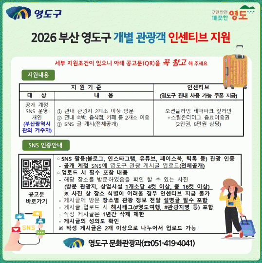 Áö¿ø ´ë»óÀº ¸¸ 18¼¼ ÀÌ»ó ºÎ»ê °ü¿Ü °ÅÁÖÀÚ·Î, °ø°³ SNS °èÁ¤À» ¿î¿µÇÏ´Â °³ÀÎ °ü±¤°´ÀÌ´Ù. ¿µµµ±¸ ³» °ü±¤Áö 2°³¼Ò ÀÌ»ó°ú ¼÷¹Ú¡¤À½½ÄÁ¡¡¤Ä«Æä¡¤À¯·á üÇè½Ã¼³ µî °ü³» »ó¾÷½Ã¼³ 2°³¼Ò ÀÌ»óÀ» ÀÌ¿ëÇÑ µÚ, ¿©Çà ³»¿ëÀ» SNS¿¡ Àüü °ø°³·Î °Ô½ÃÇϸé Àμ¾Æ¼ºê ½ÅûÀÌ °¡´ÉÇÏ´Ù.