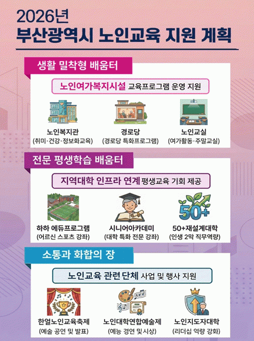 ¾î¸£½ÅµéÀÇ ¿¹¼úÀû Àç´ÉÀ» ¼±º¸ÀÌ´Â ¡®³ëÀα³À°ÃàÁ¦¡¯¿Í ¡®³ëÀδëÇп¬ÇÕ¿¹¼úÁ¦¡¯ °³ÃÖ¸¦ Áö¿øÇϰí, ³ëÀÎÁöµµÀÚ´ëÇÐÀ» ¿î¿µÇØ Áö¿ª ³ëÀÎ ¸®´õµéÀÇ ¿ª·®À» °ÈÇϸç ÁÖµµÀûÀÎ ÇнÀ ³×Æ®¿öÅ©¸¦ Çü¼ºÇϵµ·Ï µ½´Â´Ù.