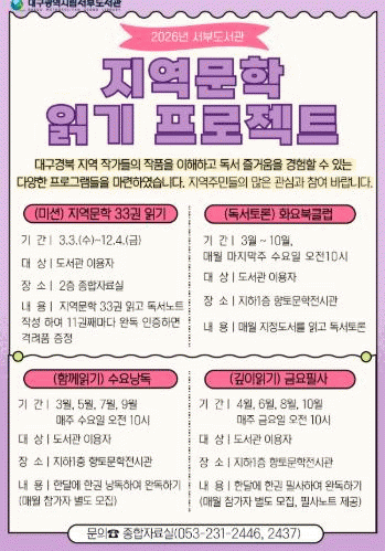 Áö¿ª¹®ÇÐ Àбâ ÇÁ·ÎÁ§Æ®´Â ´ë±¸°æºÏ Áö¿ª Ãâ½Å ±ÙÇö´ë ÀÛ°¡µéÀÇ ÀÛǰÀ» ÅëÇØ Ã¥ ÀбâÀÇ Áñ°Å¿ò°ú ±Û¾²±âÀÇ °¡Ä¡¸¦ ÇÔ²² °æÇèÇÒ ¼ö ÀÖµµ·Ï ¸¶·ÃµÆ´Ù.