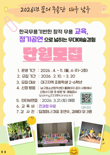 ¸ðÁý ±â°£Àº 3¿ù 20ÀϱîÁö·Î ¸ðÁý ´ë»óÀº ÃʵîÇлýÀ̸ç, ÀÚ¼¼ÇÑ »çÇ×Àº ³²±¸ ȨÆäÀÌÁö ³»(³²±¸Ã»¼Ò³ââÀÛ¼¾ÅÍ) °øÁö»çÇ×À» Âü°íÇÏ¿© ½ÅûÇÏ¸é µÈ´Ù. ¹®ÀÇ»çÇ×Àº ³²±¸Ã»¼Ò³ââÀÛ¼¾ÅÍ·Î ÀüÈÇÏ¸é ¾È³»¹ÞÀ» ¼ö ÀÖ´Ù.