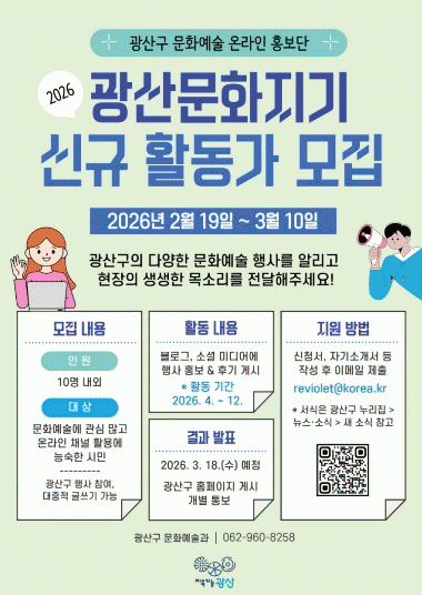¡®±¤»ê¹®ÈÁö±â¡¯´Â ±¤»ê±¸ÀÇ ´Ù¾çÇÑ ¹®È¿¹¼ú °ø¿¬°ú Çà»ç ÇöÀåÀ» Á÷Á¢ ÃëÀçÇϰí, ´©¸®¼ÒÅë¸Á(SNS)¿¡ »ý»ýÇÑ Èı⸦ ÀÛ¼º, °øÀ¯ÇÏ´Â ¿Â¶óÀÎ È«º¸´ÜÀÌ´Ù.
