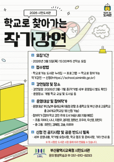 Âü°¡¸¦ Èñ¸ÁÇÏ´Â Çб³´Â ´ÙÀ½´Þ 5ÀÏ ¿ÀÈÄ 3½ÃºÎÅÍ ¡®Çб³·Î °¡´Â µµ¼°ü¡¯ ´©¸®Áý¿¡¼ ¼±Âø¼øÀ¸·Î ½ÅûÇÒ ¼ö ÀÖ´Ù. »ó¼¼ ³»¿ëÀº ½Ã¹Îµµ¼°ü Æò»ýÇнÀ°ú(¢Î051-810-8293)·Î ¹®ÀÇÇÏ¸é µÈ´Ù.
