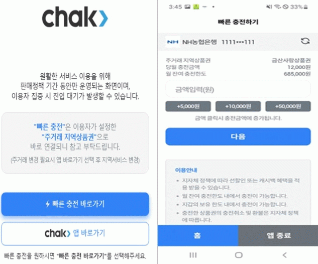 ¿øÈ°ÇÑ ÀÌ¿ëÀ» À§Çؼ´Â ÆÇ¸Å °³½Ã 1~2ÀÏ Àü±îÁö ¡®chak¡¯ ¾Û¿¡¼ ¿©¼ö»ç¶û»óǰ±ÇÀ» ¡®ÁÖ°Å·¡ »óǰ±Ç¡¯À¸·Î ¼³Á¤ÇØ¾ß ÇÑ´Ù. À̸¦ ¼³Á¤ÇÏÁö ¾ÊÀ» °æ¿ì ºü¸¥ ÃæÀü ¹öưÀ» ´·¯µµ ±âÁ¸ ¸ÞÀΠȸéÀ¸·Î À̵¿µÅ ´ë±â ½Ã°£ÀÌ ±æ¾îÁú ¼ö ÀÖ´Ù.