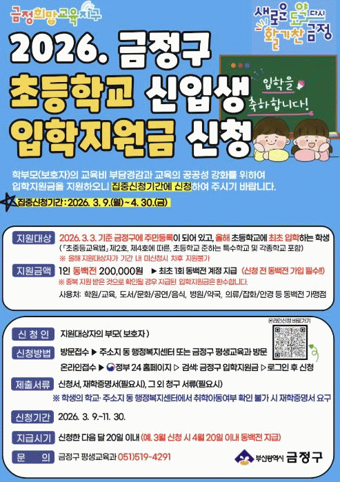 2026³â ±ÝÁ¤±¸ ÃʵîÇб³ ÀÔÇÐÁö¿ø±Ý ½ÅûÀº 3¿ù 9ÀϺÎÅÍ ½ÅûÇÒ ¼ö ÀÖÀ¸¸ç, Áö¿ø ´ë»óÀº ¿ÃÇØ 3¿ù 3ÀÏ ±âÁØÀ¸·Î ±ÝÁ¤±¸¿¡ Áֹεî·ÏÀÌ µÇ¾î ÀÖ°í, ÃʵîÇб³¿¡ ÃÖÃÊ ÀÔÇÐÇÏ´Â ÇлýÀ¸·Î ¼Òµæ ¼öÁØ¿¡ °ü°è¾øÀÌ Áö¿øÇÑ´Ù.