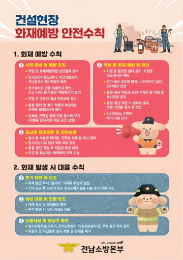 ¡ãÀÛ¾÷ Àü ȱâÃë±Þ ÀÛ¾÷ ½ÂÀÎ ÀýÂ÷ Áؼö ¡ãÀӽüҹæ½Ã¼³ ÀûÁ¤ ¹èÄ¡¡ãÀÛ¾÷Àå ÁÖº¯ °¡¿¬¹° ¹× ÀÎȼº ¹°Áú Á¦°Å¡ã¿ëÁ¢.¿ë´Ü ÀÛ¾÷ ½Ã ÈÀç °¨½ÃÀÚ ¹èÄ¡ µî ÈÀç¾ÈÀü¼öÄ¢ Áؼö¸¦ ÁßÁ¡ÀûÀ¸·Î ÁöµµÇÒ ¿¹Á¤ÀÌ´Ù. ¶ÇÇÑ ÀÛ¾÷ Á¾·á ÈÄ ÀÜ¿© ºÒ¾¾·Î ÀÎÇÑ ÈÀ縦 ¹æÁöÇϱâ À§ÇÑ »çÈÄ Á¡°Ë°ú °ø»çÀå ³» Æó±â¹° ¹× °¡¿¬¼º ÀÚÀç Á¤¸® µî ±âº»ÀûÀÎ ¾ÈÀü°ü¸® »çÇ×µµ ÇÔ²² ¾È³»ÇÒ °èȹÀÌ´Ù.