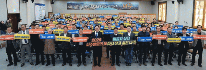 Çà»ç¿¡ Âü¼®ÇÑ ±â°ü°ú ´Üü °ü°èÀÚµéÀº °ü±¤µµ½Ã ³ªÁÖÀÇ Ã¹ÀλóÀ» ½Ã¹ÎÀÌ ÇÔ²² ¸¸µé¾î °£´Ù´Â Àǹ̸¦ °øÀ¯ÇÏ¸ç ¡®2026 ³ªÁֹ湮ÀÇ ÇØ¡¯ ¼º°ø °³ÃÖ¸¦ À§ÇÑ °øµ¿ÀÇ ÀÇÁö¸¦ ´ÙÁ³´Ù.