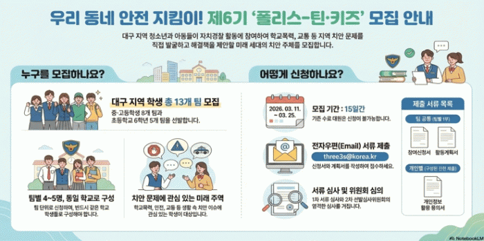 ¸ðÁý ±â°£Àº 3¿ù 11ÀϺÎÅÍ 25ÀϱîÁöÀ̸ç, ´ë±¸½Ã ³» ÃÊ¡¤Áß¡¤°í ÇлýÀ» ´ë»óÀ¸·Î Áß¡¤°íµîÇлýÀ¸·Î ±¸¼ºµÈ ¡®Æú¸®½º-ƾ¡¯ 8°³ ÆÀ°ú ÃʵîÇб³ 6ÇгâÀ¸·Î ±¸¼ºµÈ ¡®Æú¸®½º-ŰÁ 5°³ ÆÀÀ» ¸ðÁýÇÑ´Ù.