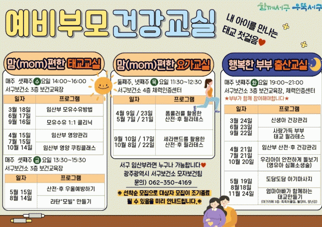 ¸Â¹úÀÌ ºÎºÎ µî ÁÖ°£ Âü¿©°¡ ¾î·Á¿î ¿©°ÇÀ» °í·ÁÇØ ¾ß°£¿¡µµ ÇÁ·Î±×·¥À» ¿î¿µÇÑ´Ù. ¡®ÇູÇÑ ºÎºÎ Ãâ»ê±³½Ç¡¯Àº ¿ù 1ȸ ¿î¿µÇÏ¸ç ºÎºÎ°¡ ÇÔ²² Âü¿©ÇØ À°¾Æ Áö½ÄÀ» ½ÀµæÇϰí ÅÂ¾Æ¿Í Á¤¼ÀûÀ¸·Î ±³°¨ÇÒ ¼ö ÀÖµµ·Ï ±¸¼ºÇÑ´Ù. ±³À°Àº ½Å»ý¾Æ ¹× »ê¿å±â °Ç°°ü¸® µî À̷б³À°°ú ÇÔ²² ºÎºÎ µ¿¹Ý ¸¸µé±â Ȱµ¿, ½Å»ý¾Æ ÀÀ±Þ´ëó ½ÉÆó¼Ò»ý¼ú(CPR), ºÎºÎ ÇʶóÅ×½º µî üÇèÇü ÇÁ·Î±×·¥À¸·Î ±¸¼ºÇØ ¿¹ºñºÎ¸ðÀÇ ½ÇÀü ´ëÀÀ·ÂÀ» ³ôÀδÙ. ¶ÇÇÑ ÀÓ»êºÎÀÇ ¸¶À½°Ç° °ü¸® ÇÁ·Î±×·¥µµ º´ÇàÇØ »êÀü¡¤»êÈÄ ¿ì¿ïÁõ ¿¹¹æ°ú ½É¸®Àû ¾ÈÁ¤À» Áö¿øÇÒ °èȹÀÌ´Ù. ÇÁ·Î±×·¥ Âü¿© ½Åû µî ÀÚ¼¼ÇÑ »çÇ×Àº ¼±¸º¸°Ç¼Ò ¸ðÀÚº¸°ÇÆÀ(062-350-4139)·Î ¹®ÀÇÇÏ¸é µÈ´Ù.