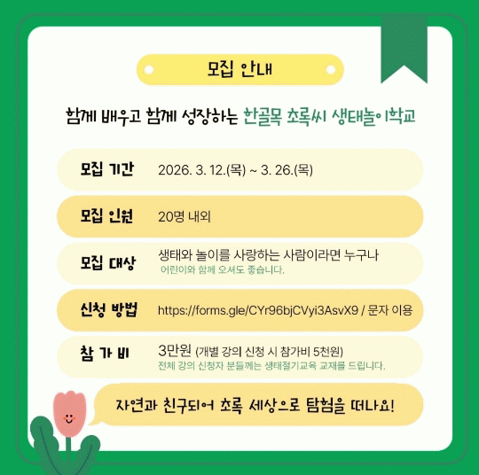 ¸ðÁý±â°£Àº ¿À´Â 26ÀϱîÁöÀ̸ç, »ýÅÂ¿Í ³îÀÌ¿¡ °ü½É ÀÖ´Â ´©±¸³ª ½Åû °¡´ÉÇÏ´Ù. ¸ðÁýÀοøÀº 20¸í ³»¿Ü·Î, Âü°¡ºñ´Â 3¸¸¿øÀÌ¸ç °³º° °ÀÇ ½Åûµµ °¡´ÉÇÏ´Ù.