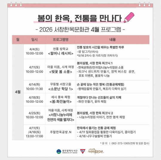 À̹ø ÇÁ·Î±×·¥Àº ¹«Çü¹®ÈÀç Àü¼öÀÚ¿Í ÇÔ²²ÇÏ´Â ÀüÅë À½½Ä üÇè°ú ÇÑ¿Á ÇÇÅ©´Ð, ÀüÅë°ø¿¹ üÇè µîÀ¸·Î ±¸¼ºÇß´Ù.