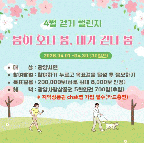 ÇÑÆí, ±¤¾ç½Ã´Â »ýȰ ¼Ó ¿òÁ÷ÀÓÀ» Ȱ¼ºÈÇÏ°í ½Ã¹Î °Ç° ÁõÁøÀ» À§ÇØ ¸ð¹ÙÀÏ °È±â¾Û ¡®¿öÅ©¿Â¡¯À» Ȱ¿ëÇÑ °È±â 縰Áö¸¦ ¸Å¿ù ¿î¿µÇϰí ÀÖÀ¸¸ç, ÇöÀç ±¤¾ç½Ã °ø½Ä Ä¿¹Â´ÏƼ¿¡ ´©Àû 10,334¿© ¸íÀÌ °¡ÀÔÇØ Ȱ¹ßÇÏ°Ô ¿î¿µµÇ°í ÀÖ´Ù.