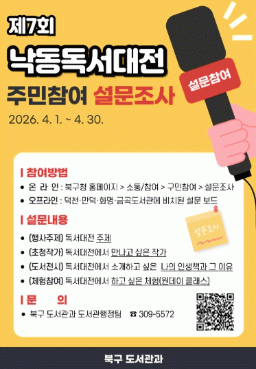 À̹ø ¼³¹®Á¶»ç´Â ±¸¹ÎÀÌ Á÷Á¢ ¸¸µé¾î°¡´Â µ¶¼ ¹®È ÃàÁ¦¸¦ ±¸ÇöÇϱâ À§ÇÑ °ÍÀ¸·Î, Çà»ç ÁÖÁ¦, ÃÊû ÀÛ°¡, Èñ¸Á Àü½Ãµµ¼ µî ¡®2026³â ³«µ¿µ¶¼´ëÀüÀÇ ÇÙ½É ÇÁ·Î±×·¥¡¯¿¡ ´ëÇÑ ±¸¹ÎÀÇ ¼±È£¸¦ Á¶»çÇÑ´Ù. ¼±Á¤µÈ ÀǰßÀº º»Çà»ç¿Í ¿¬ÁßÇà»ç¿¡ Àû±Ø ¹Ý¿µÇÒ °èȹÀÌ´Ù.