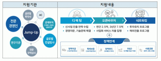 'µµ¾à(Jump-Up) ÇÁ·Î±×·¥'Àº ¿ì¼öÇÑ ¼ºÀ强°ú ±â¼ú·ÂÀ» °®Ãá ¾÷·Â 7³â ÀÌ»óÀÇ Áß¼Ò±â¾÷ÀÌ ½Å»ç¾÷¡¤½Å½ÃÀå ÁøÃâÀ» ÅëÇØ »õ·Î¿î ¼ºÀ嵿·ÂÀ» È®º¸Çϰí Áß°ß±â¾÷À¸·Î µµ¾àÇÒ ¼ö ÀÖµµ·Ï Áö¿øÇÏ´Â »ç¾÷À¸·Î, ¸Å³â 100°³»ç¸¦ ¼±Á¤ÇØ 2029³â±îÁö ÃÑ 500°³»ç¸¦ À°¼ºÇÒ °èȹÀÌ´Ù.