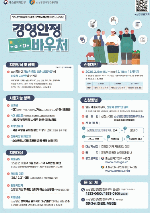 Áö¿ø ´ë»óÀº 2025³â ±âÁØ ¿¬ ¸ÅÃâ¾× 1¾ï 4¹é¸¸¿ø ¹Ì¸¸ÀÇ ¼Ò»ó°øÀÎÀ¸·Î, ½ÅûÀÏ ±âÁØ Á¤»ó ¿µ¾÷ ÁßÀÎ »ç¾÷ÀÚ¶ó¸é ´ëºÎºÐ ½ÅûÀÌ °¡´ÉÇÏ´Ù.