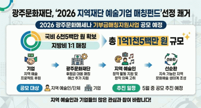 ÀÌ¿¡ µû¶ó ¿À´Â 5¿ù, Áö¿ª ¿¹¼úÀΰú ±â¾÷À» ´ë»óÀ¸·Î ¡®2026 ±¤ÁÖ¹®È¸Þ¼¼³ª ±âºÎ±Ý¸ÅĪÁö¿ø»ç¾÷¡¯ °ø¸ð¸¦ ½ÃÇàÇÒ ¿¹Á¤ÀÌ´Ù.