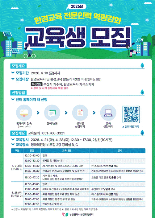 À̹ø ±³À°Àº ½Ã°¡ ÁÖÃÖÇÏ°í ºÎ»ê±¤¿ª½Ãȯ°æ±³À°¼¾ÅͰ¡ ÁÖ°üÇϸç, ȯ°æ±³À° ÇöÀå¿¡¼ Ȱ¿ëÇÒ ¼ö ÀÖ´Â ½Ç¹« Á᫐ ±³À°À¸·Î ¸¶·ÃµÆ´Ù.