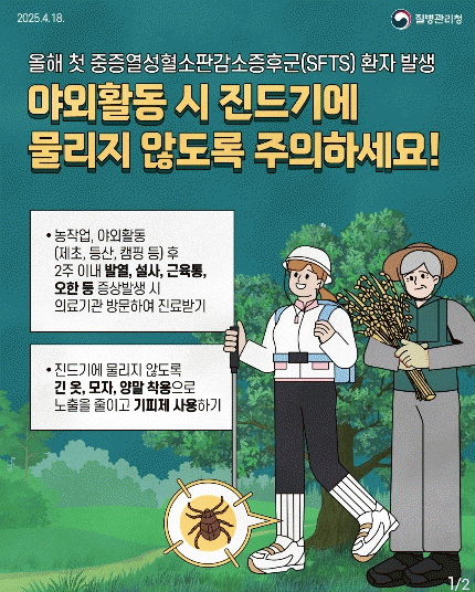 ÁßÁõ¿¼ºÇ÷¼ÒÆÇ°¨¼ÒÁõÈıº(SFTS)Àº ³óÀÛ¾÷, Àӻ깰 äÃë, µî»ê µî ¾ß¿ÜȰµ¿ °úÁ¤¿¡¼ Áøµå±â¿¡ ¹°·Á °¨¿°µÇ´Â ÁúȯÀ¸·Î, ÁÖ·Î º½ºÎÅÍ ¹ß»ýÇÑ´Ù. Àẹ±â´Â 5ÀÏ¿¡¼ 14ÀÏÀ̸ç, 38µµ ÀÌ»óÀÇ °í¿°ú ¿À½É, ±¸Åä, ¼³»ç µî ¼Òȱâ Áõ»óÀÌ ³ªÅ¸³¯ ¼ö ÀÖ´Ù. Ä¡¸í·üÀÌ ³ô°í ¿¹¹æ ¹é½Å°ú Ä¡·áÁ¦°¡ ¾ø¾î ÁÖÀǰ¡ ÇÊ¿äÇÏ´Ù.