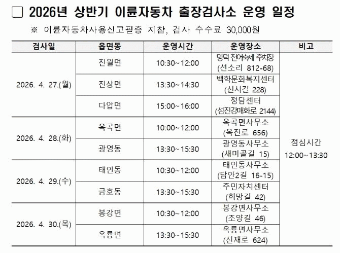 °Ë»ç¸¦ ¹ÞÀ¸·Á´Â ¼ÒÀ¯ÀÚ´Â ÀÌ·ûÀÚµ¿Â÷»ç¿ë½Å°íÇÊÁõ°ú °Ë»ç ¼ö¼ö·á µîÀ» ÁغñÇØ ÁöÁ¤µÈ Àå¼Ò¸¦ ¹æ¹®ÇÏ¸é µÈ´Ù.