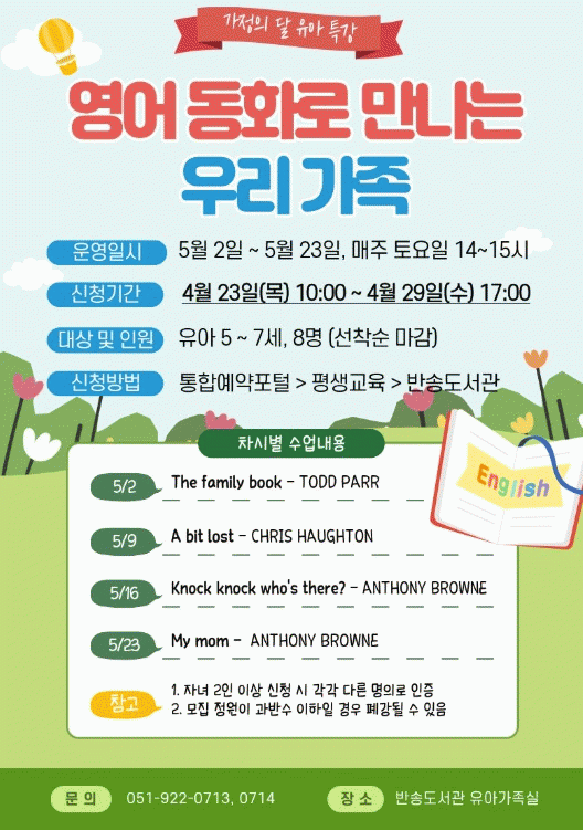 ÇÁ·Î±×·¥Àº ¡®The Family Book¡¯, ¡®Knock Knock Who¡¯s There?¡¯ µî °¡Á·À» ÁÖÁ¦·Î ÇÑ ¿µ¾î ±×¸²Ã¥À» ÇÔ²² Àаí À̾߱⸦ ³ª´©´Â Ȱµ¿À¸·Î ±¸¼ºµÆ´Ù.