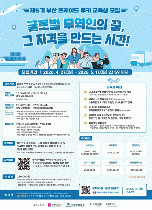 ¿ÃÇØ 5ȸ°¸¦ ¸ÂÀÌÇÑ ¡®ºÎ»ê Æ®·¹ÀÌµå ·çŰ °úÁ¤¡¯Àº ½Ç¹«Çü ¹«¿ª±³À°°ú ¼öÃ⠽ǽÀ, ±¹³»¿Ü ¹«¿ª ÇöÀå üÇè, Ãë¾÷ Áö¿ø ÇÁ·Î±×·¥À» ¿î¿µÇÏ´Â Áö¿ªÀÇ ´ëÇ¥ÀûÀÎ ¹«¿ª Àη ¾ç¼º ÇÁ·Î±×·¥ÀÌ´Ù.